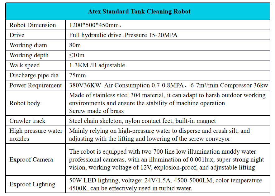 Thecrude oiltank/oil pits cleaning robot is equipped with the necessary working head and actuating componentsas ATEX 0 Zone or 1 Zone . The operator maneuvers the robot into the working area, adjusts the working head's posture and components, and activates the equipment to begin cleaning operations. During movement, the robot's actuating components perform tasks such as stirring, scouring, gathering, scooping, pushing, pumping, or suctioning (with avacuum pump) to process silt or sediment at the current location. The dredged material is ultimately transported to a sludge tank or post-treatment equipment for classification, separation, crushing, filtration, and resource recycling.
